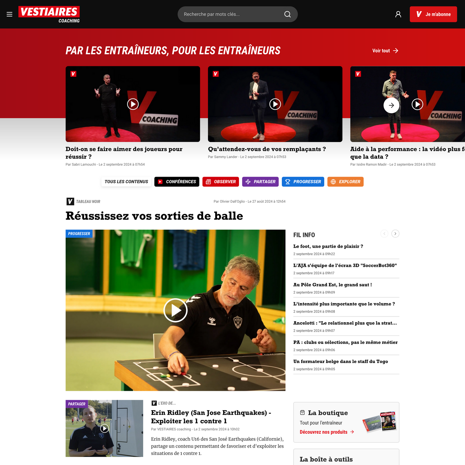 Mis en ligne le 2 septembre 2024 dans le prolongement des 119 numéros du magazine VESTIAIRES publiés depuis janvier 2009, VESTIAIRES coaching est une plateforme internationale spécialement dédiée aux éducateurs et entraîneurs de football. Un véritable outil d’aide et d’accompagnement pour tous les encadrants d’équipe, quels que soient la catégorie d’âge ou le niveau de pratique.